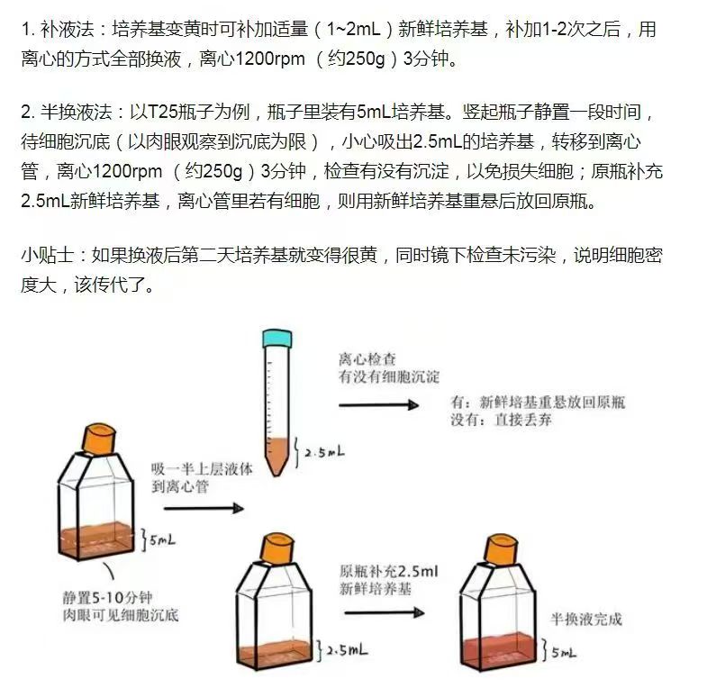 懸浮細胞狀態在無碎片無黑點的情況下無需換液,觀察培養基偏黃及時進行補液2ml左右,當細胞出現分泌物可以使用半換液法處理,參考如下圖片: